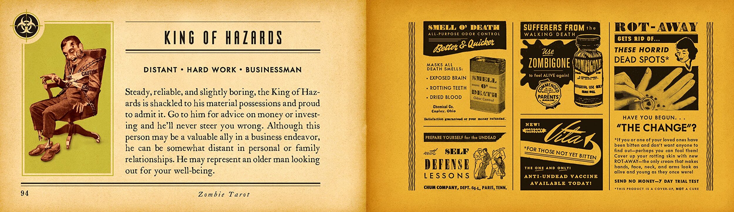 There’s not a ton of write up for each card but though this can disappointing, the captions are so clever and concise that it totally works for a beginner or for veterans who want a fun spin on their readings (if you like zombies of course). Each card is given 3 keywords for easy access to themes. Note: there’s no reversals with this deck.